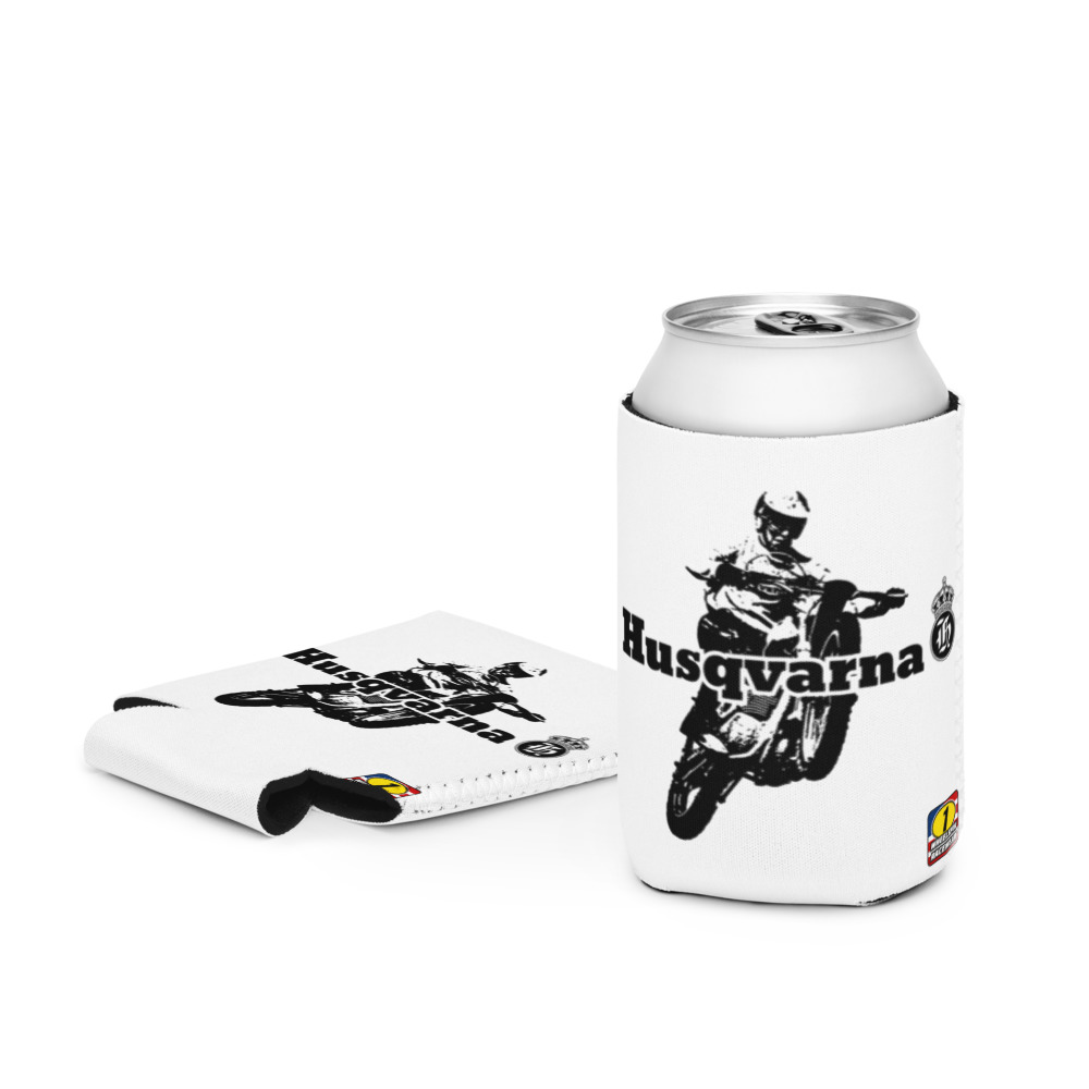 70's style Husqvarna jersey graphics printed on both sides of Moto Can Cooler.