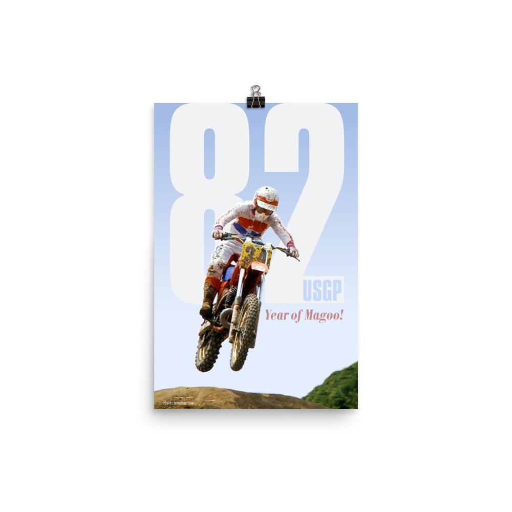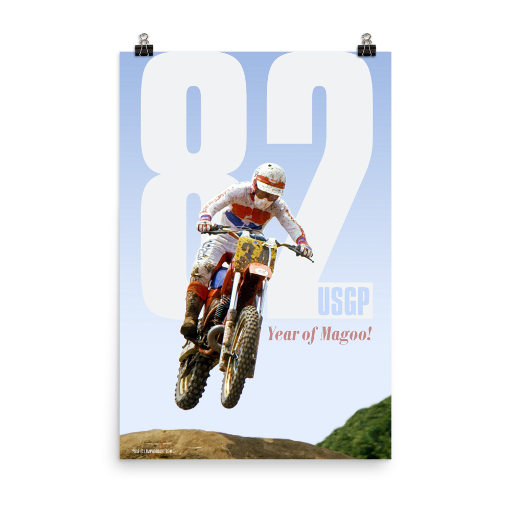 Graphic poster of Danny Magoo Chandler jumping during the 1982 500cc USGP at Carlsbad Raceway. 1982 was the year Magoo dominated the Motocross & Trophy des Nations, Superbikers and 500 USGP.