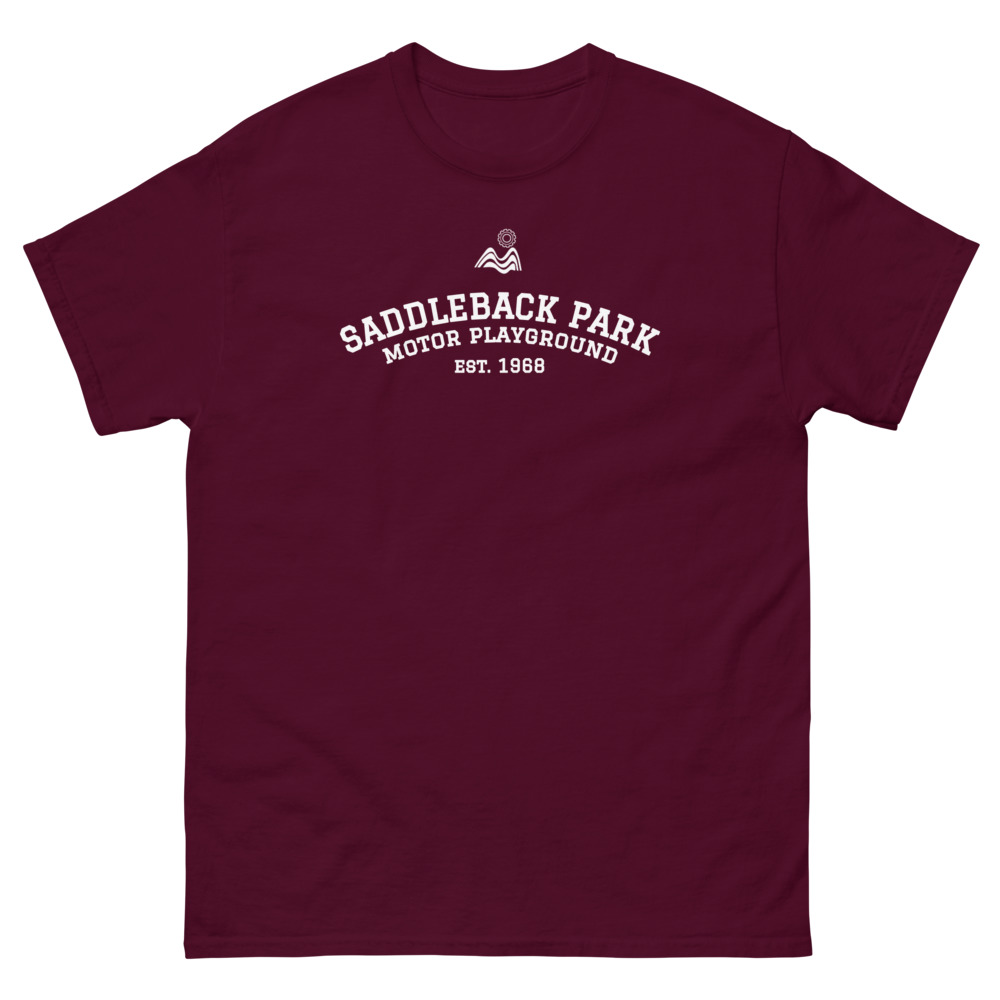 Saddleback Park Motor Playground Est 1968 in Collegiate Lettering on the Front - Relive the Glory Days of Riding and Racing at Saddleback Park.