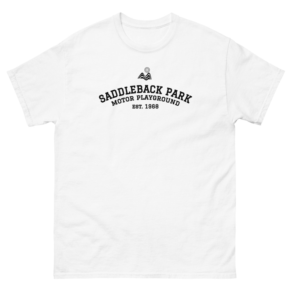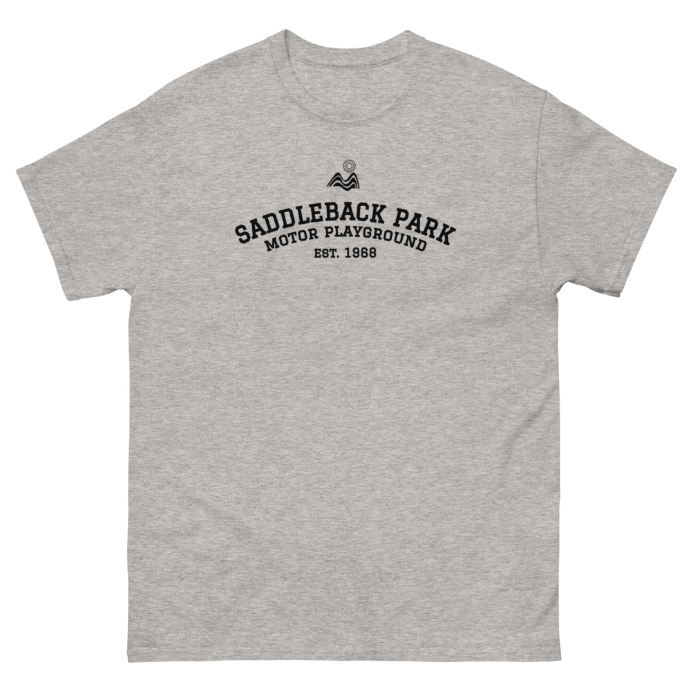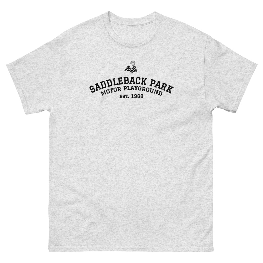 Saddleback Park Motor Playground Est 1968 in Collegiate Lettering on the Front - Relive the Glory Days of Riding and Racing at Saddleback Park.
