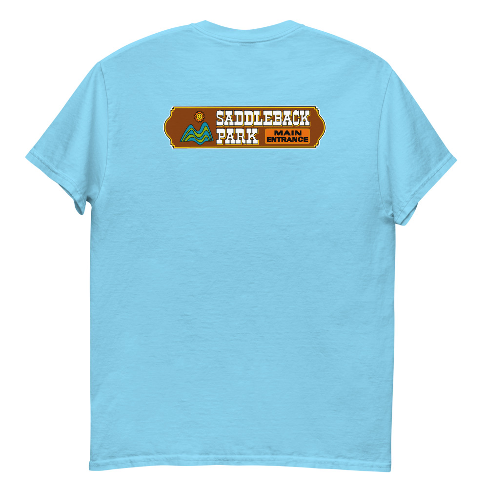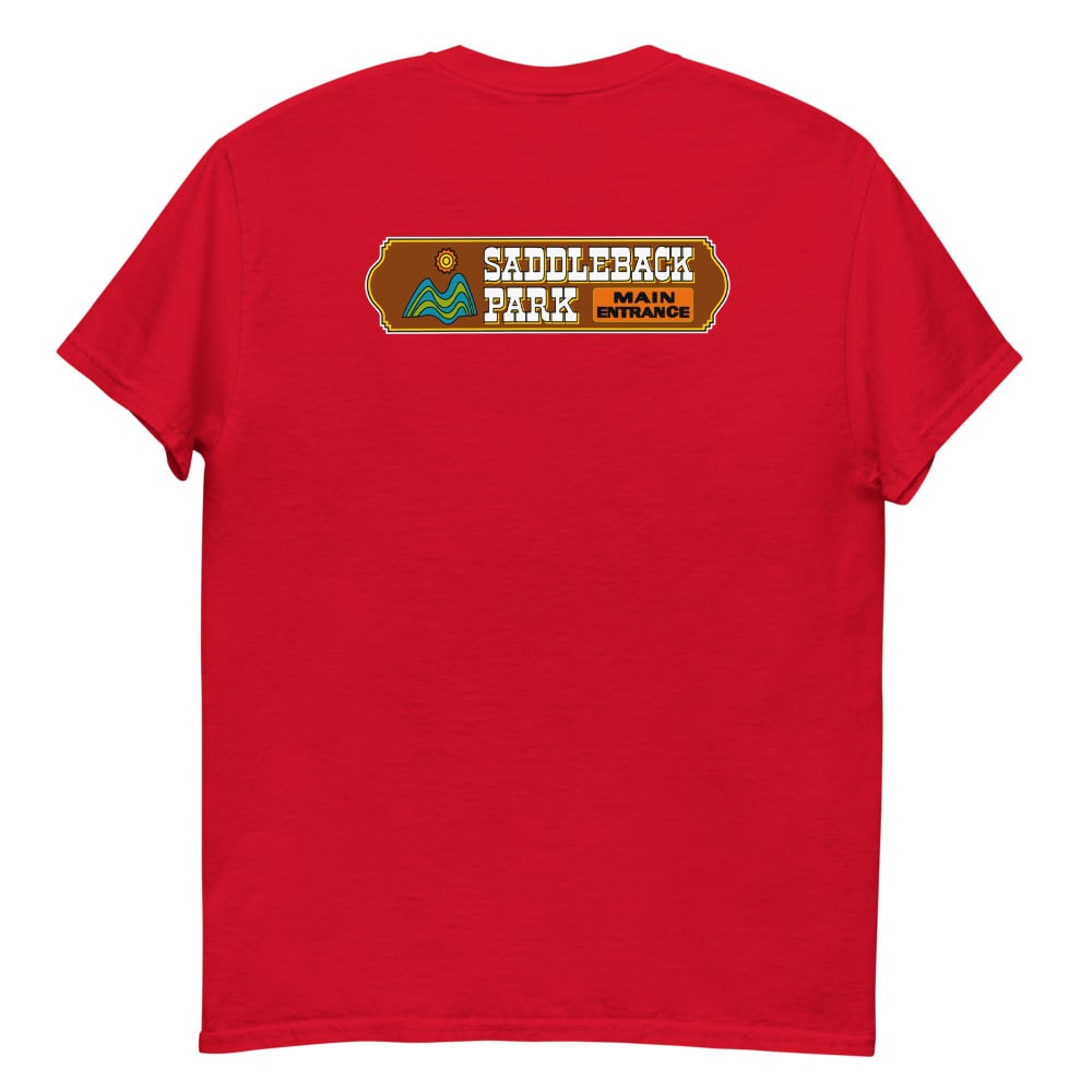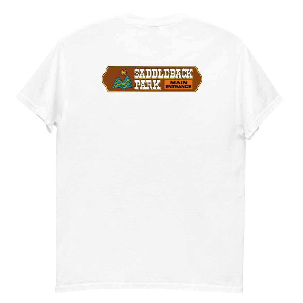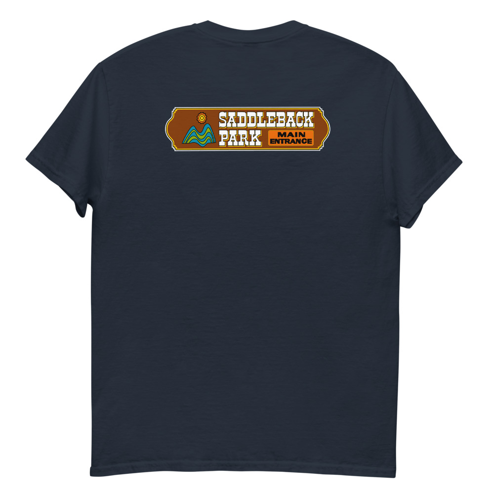 Small black/white graphic on front with the full color Saddleback Park Entry Sign graphic on the back.