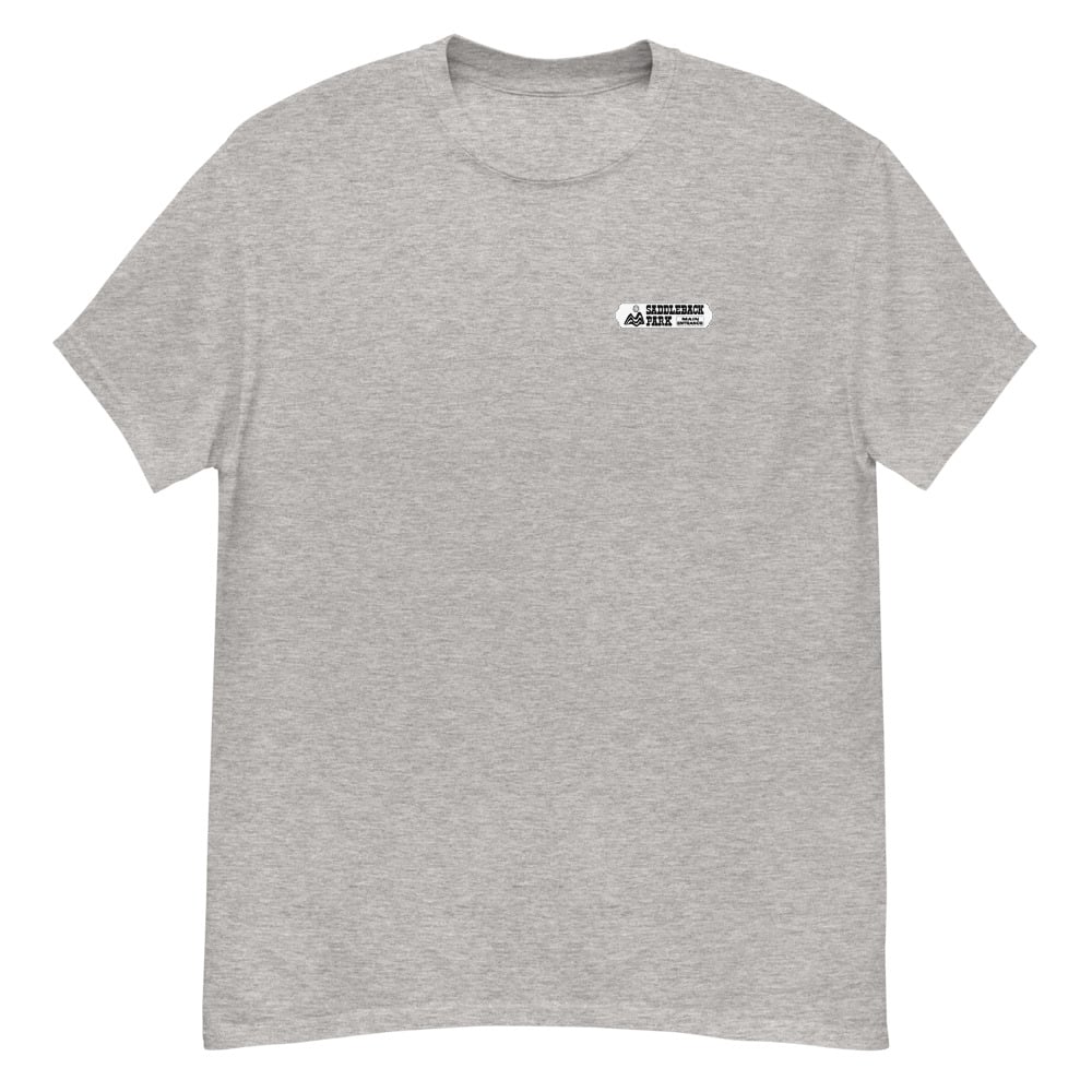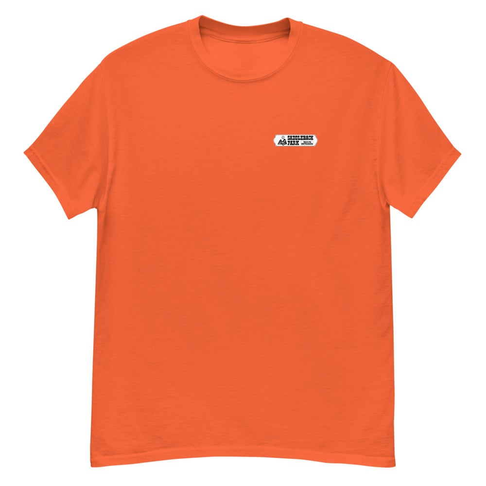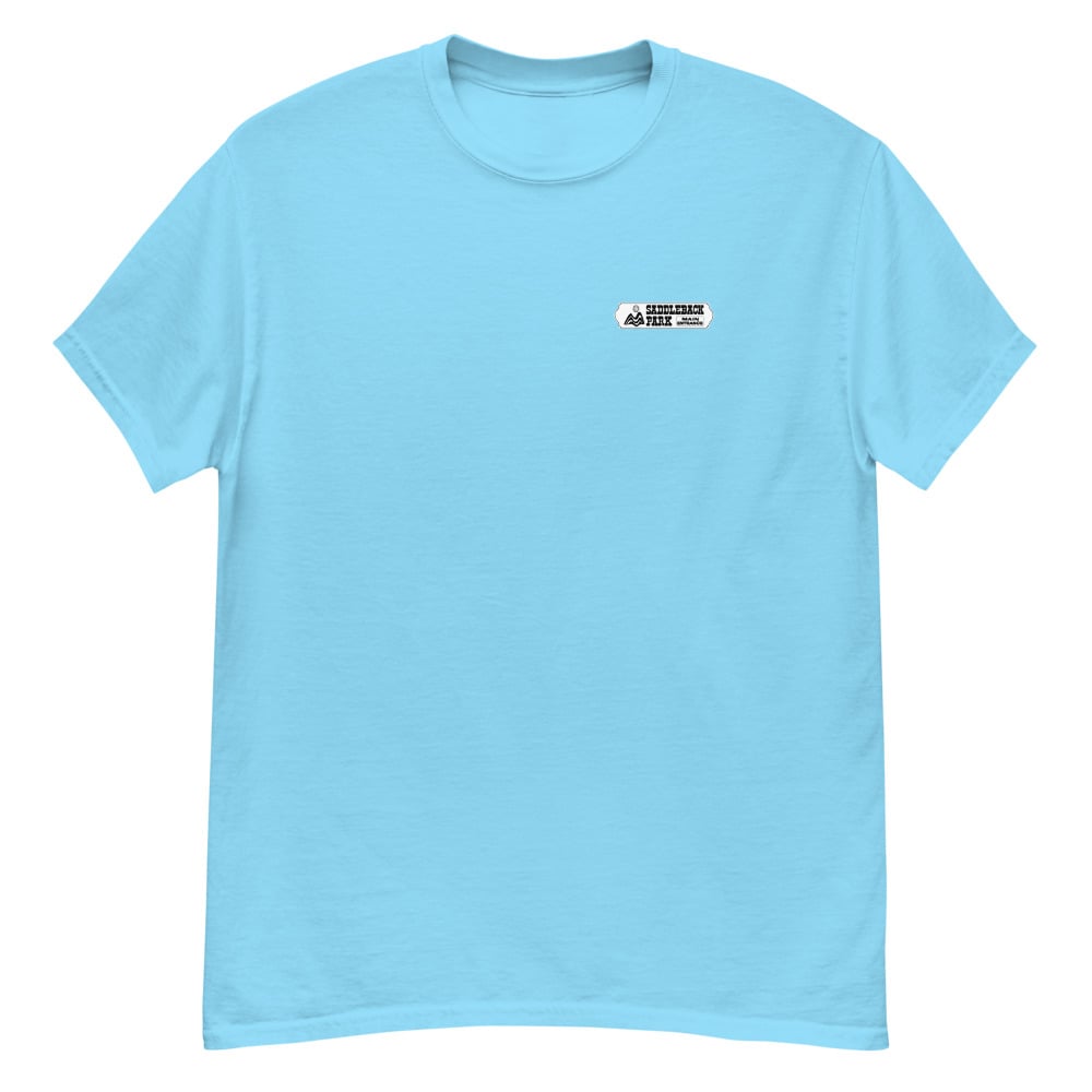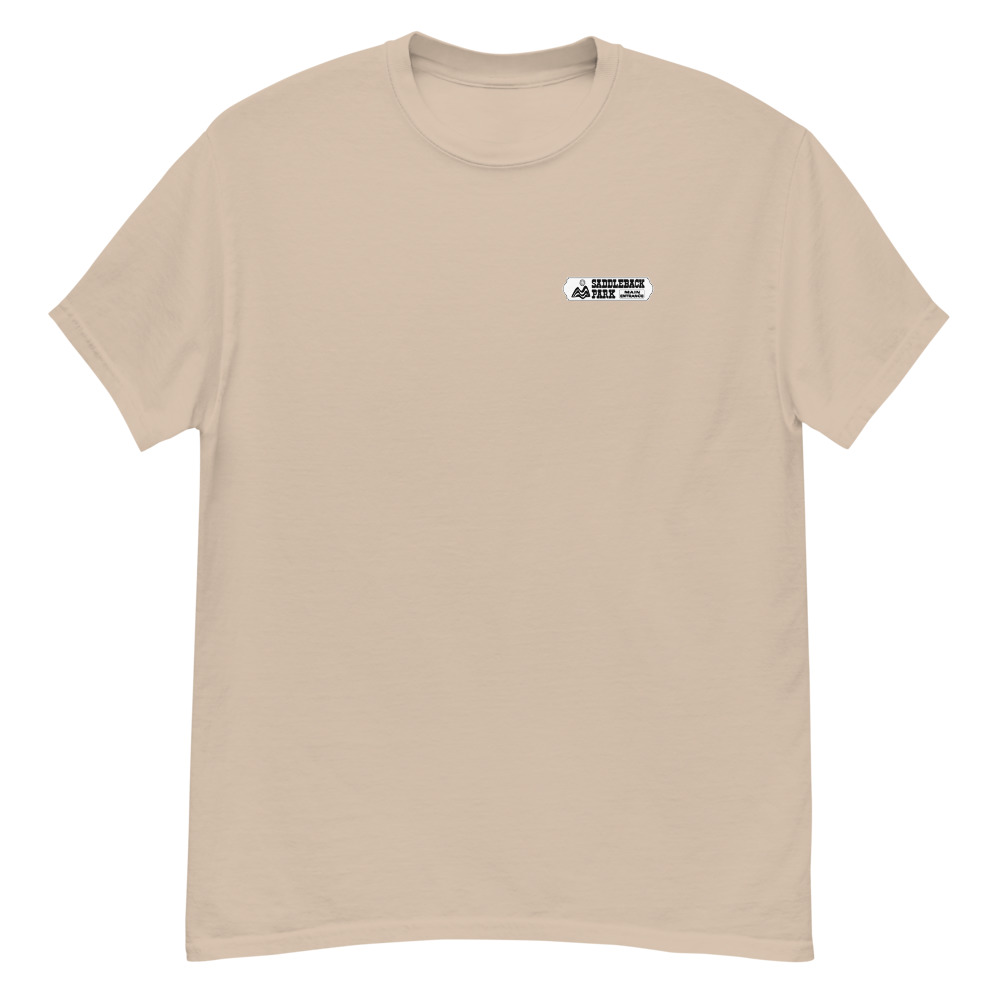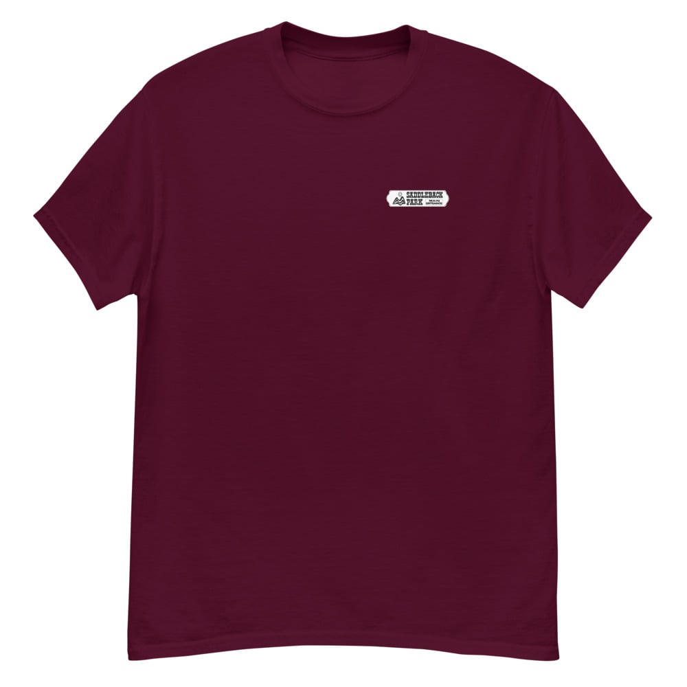 Small black/white graphic on front with the full color Saddleback Park Entry Sign graphic on the back.