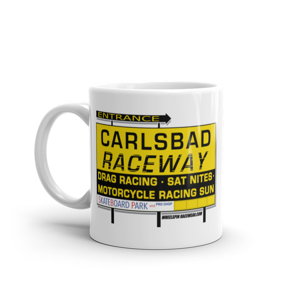 Two entrance Carlsbad Raceway sign graphics on each side of the mug.