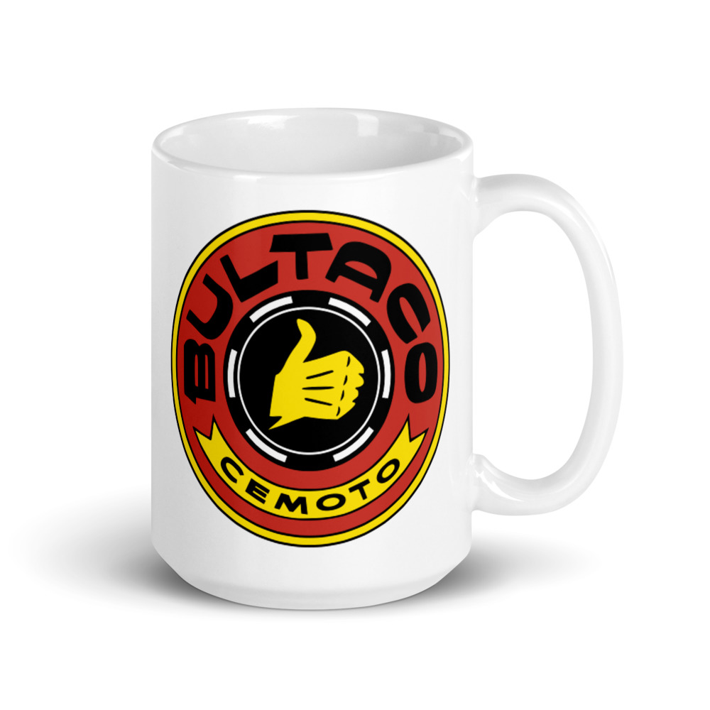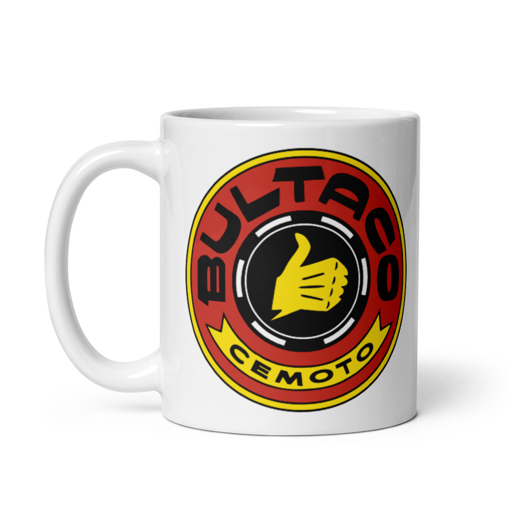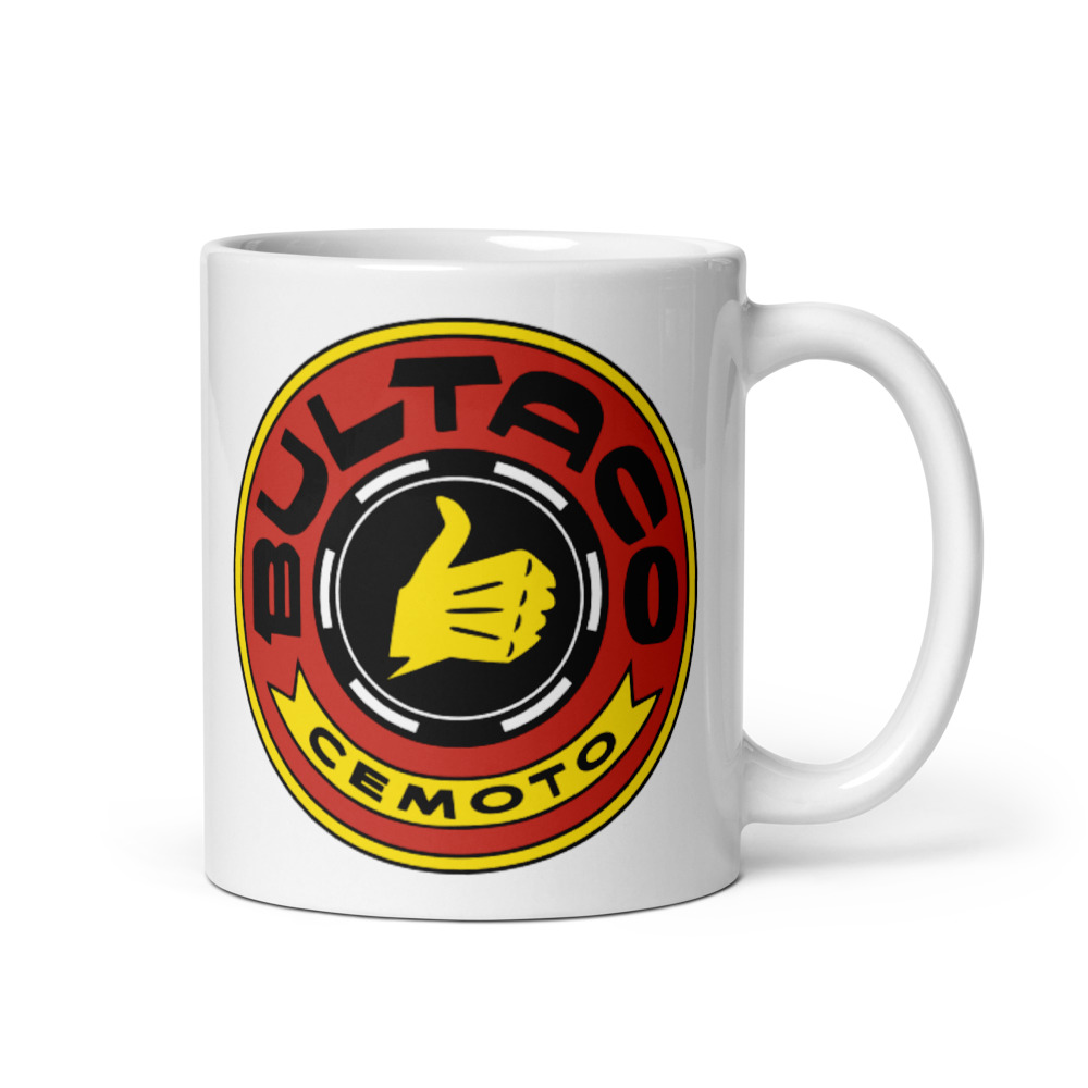 The classic Spanish style of Bultaco Cemoto emblem Moto Mug. Relive the vintage motocross glory days with every sip!