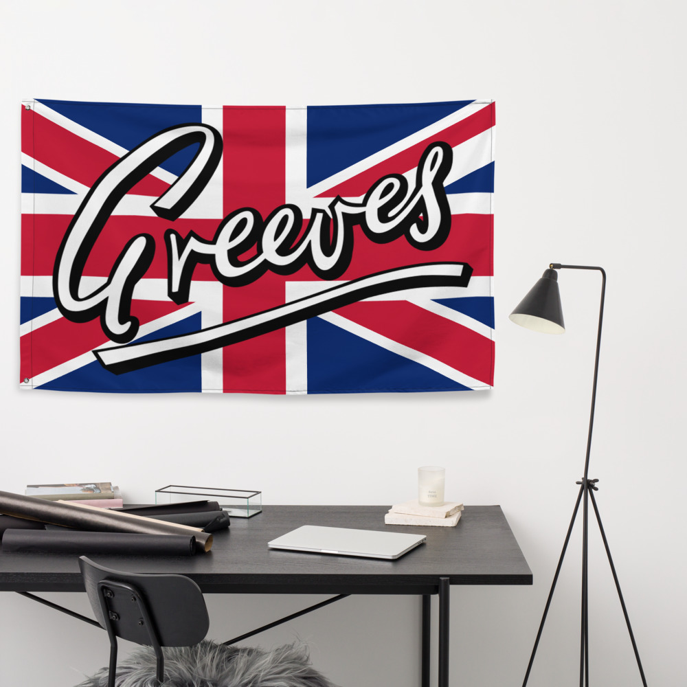 Union Jack flag with the iconic Greeves title logo. Perfect for any vintage racing fan.