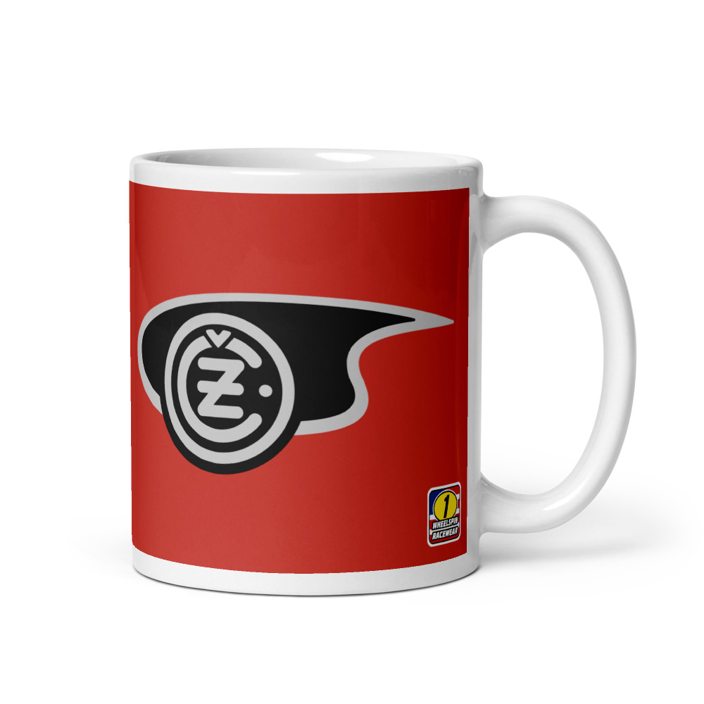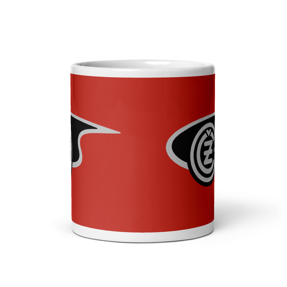 Iconic 1968 CZ Tank Logo Black-Grey - Red base on white Moto Mug. Perfect for any racing fan!