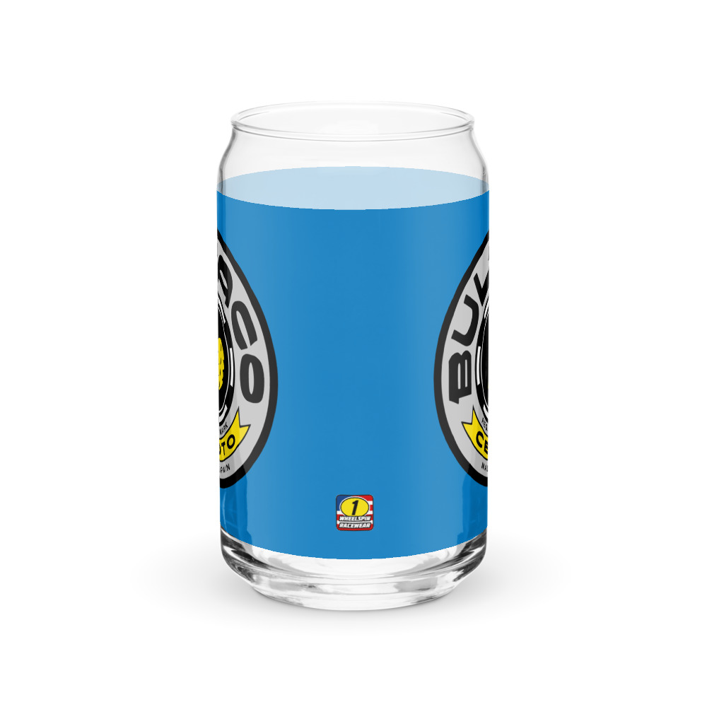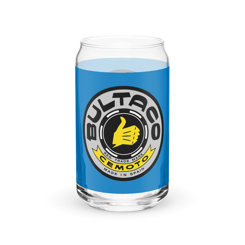 Classic Bultaco colorful emblem on Blue background on this special drinking glass formed just like a pull-tab can. How cool is that!