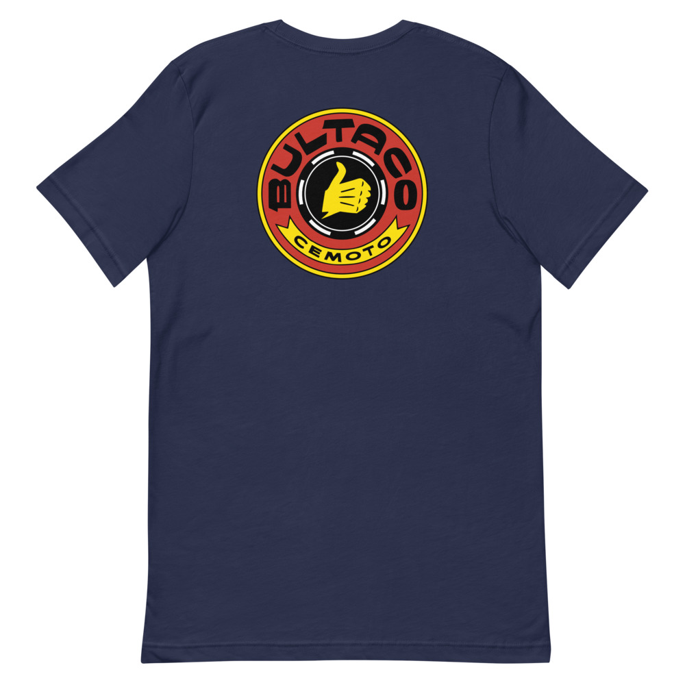Classic BULTACO Tank Emblem on front with bold, Bultaco logo on back. Perfect Moto Shirt to wear trackside while checking out the winning racing lines.